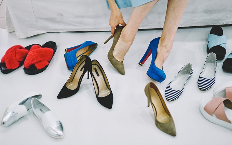 Symmetry: both shoes on flat surface, matching heel height, shape, and color.