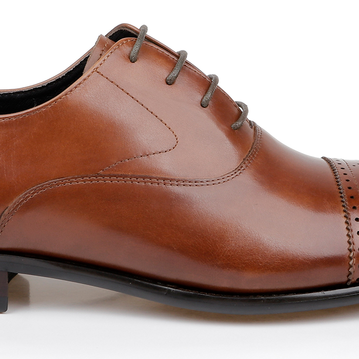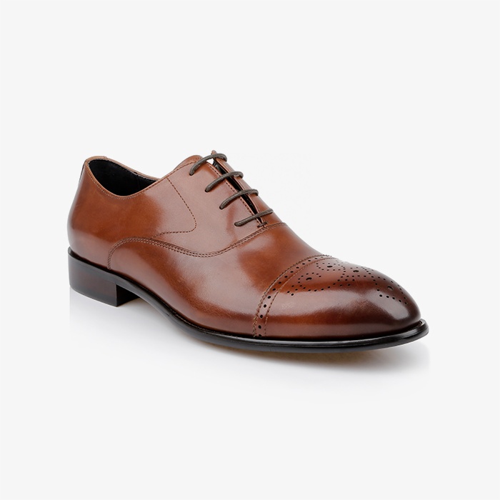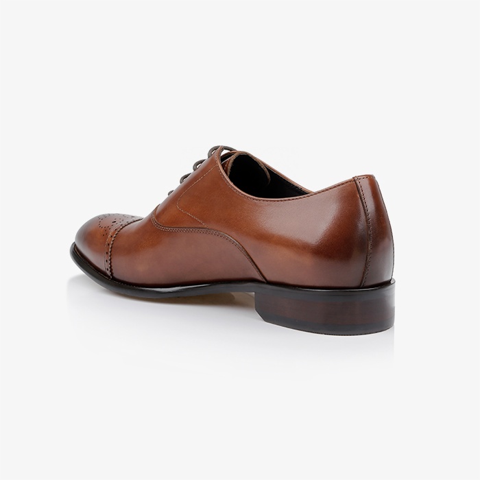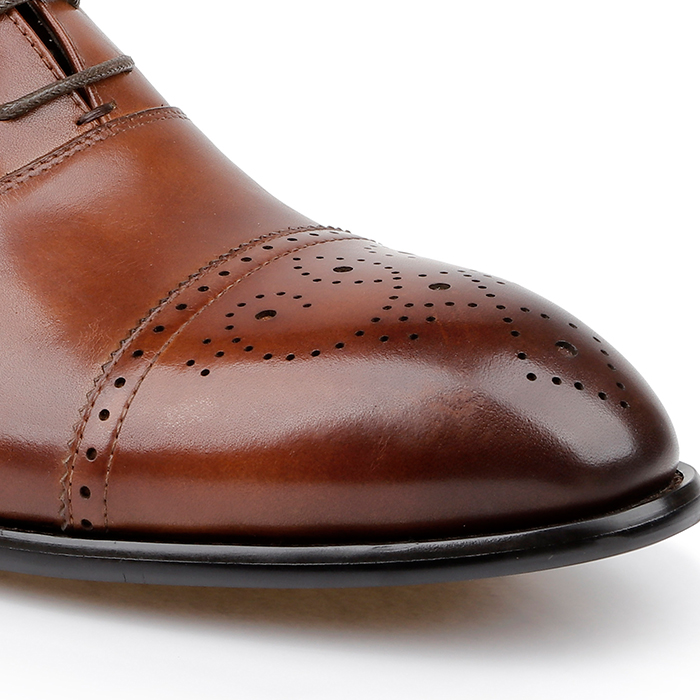 The Benjamin is a men’s dress shoe featuring burnished cow leather construction with distinctive punched toe cap detailing. The refined perforated design adds visual interest while maintaining classic formal aesthetics.