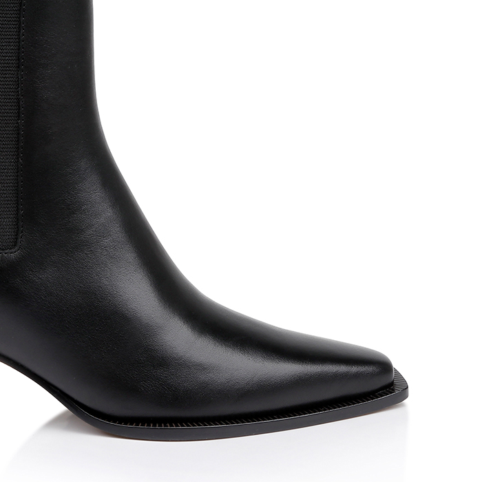 This black cow leather ankle boot features a sharp pointed toe silhouette with bold block heel construction, designed for versatile professional and casual wear applications.