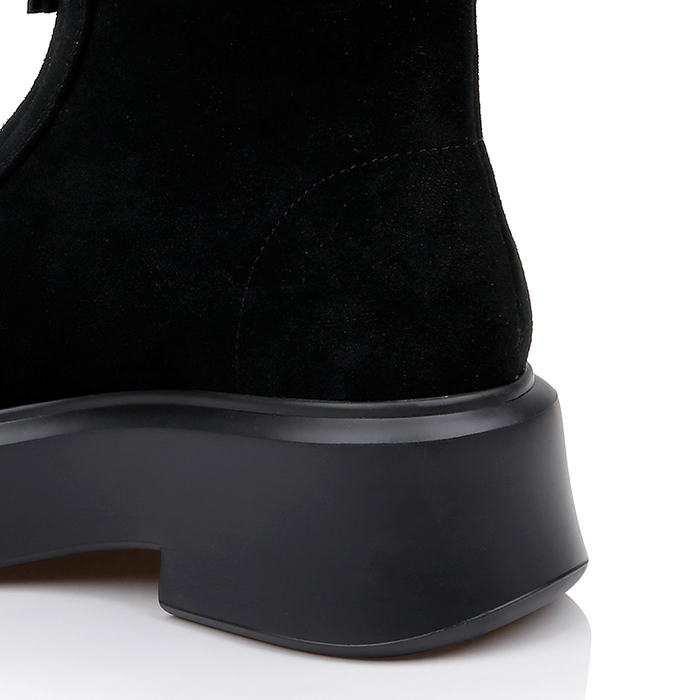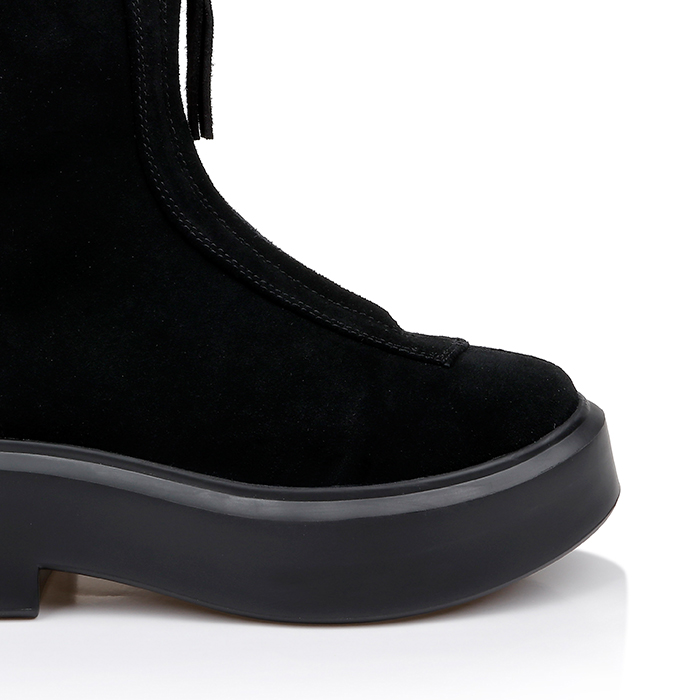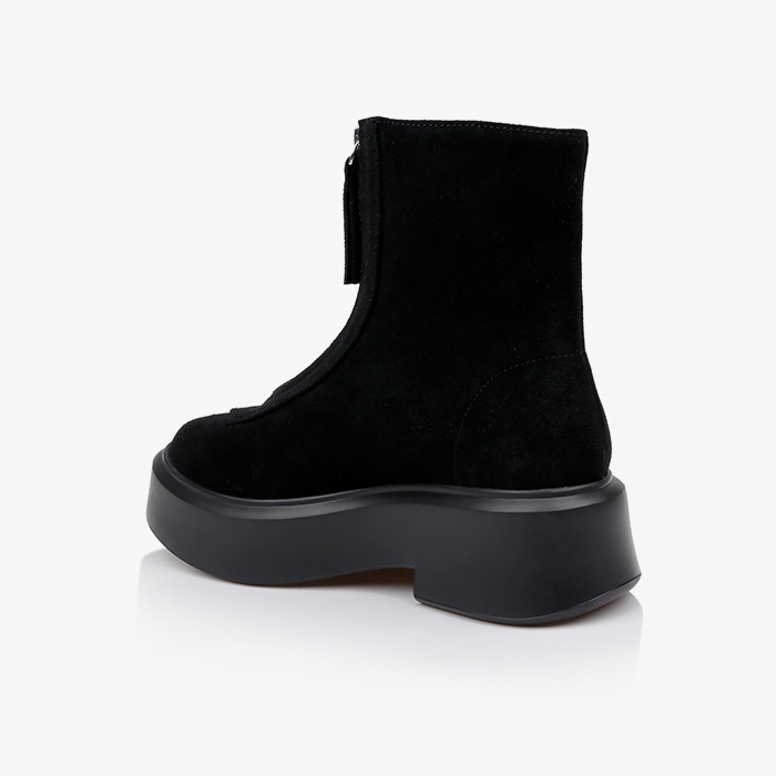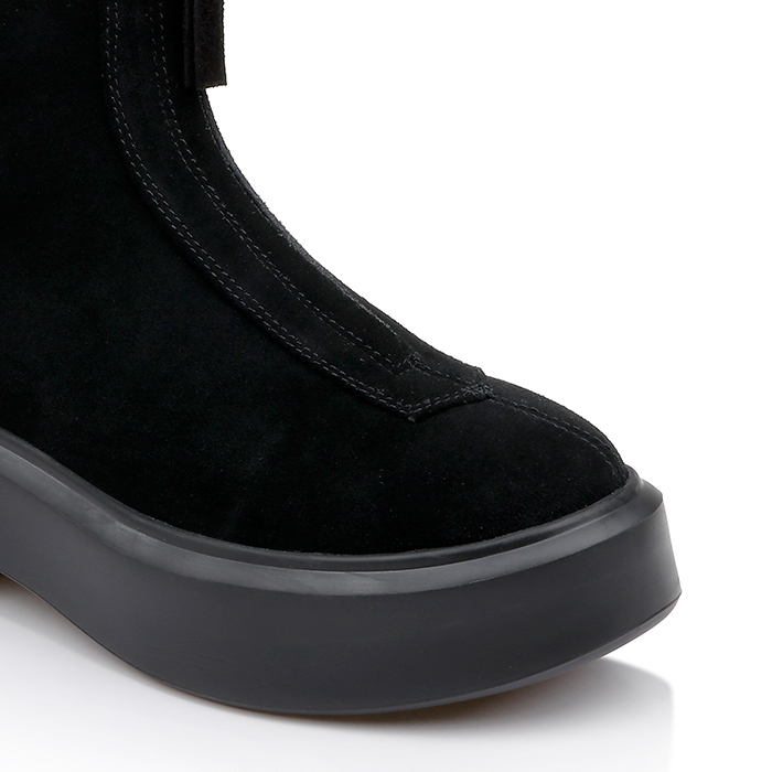 Upper constructed from genuine cow suede with full-length center zipper for easy entry. Lightweight PU outsole provides durability while maintaining sleek profile. Heavy-appearance sole unit creates visual contrast against supple suede upper.