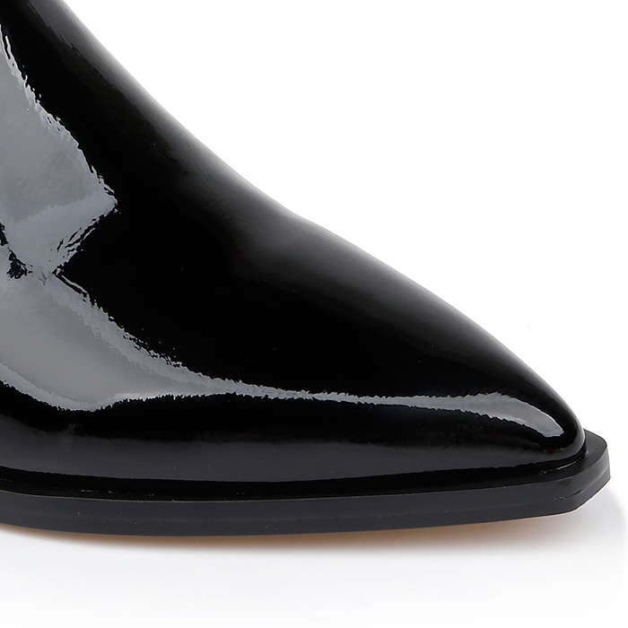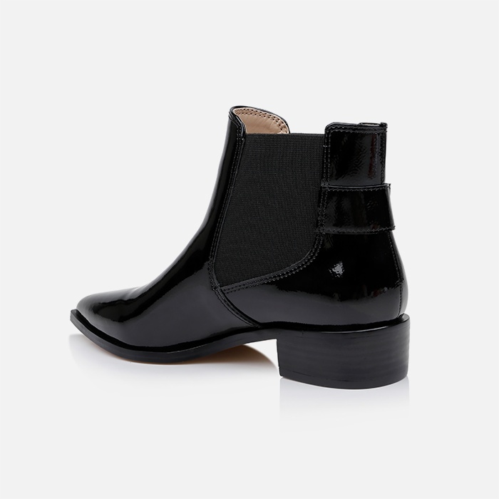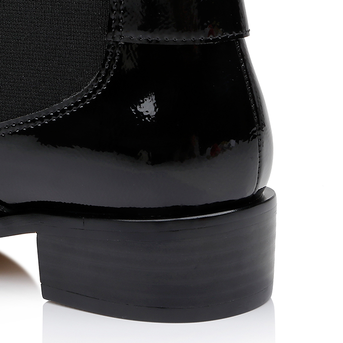 Constructed from premium cow leather with crinkle patent finish. Features 1.18″ (30mm) stacked heel and black outsole welt construction. Elastic shaft upper ensures comfortable fit and easy on/off wear.