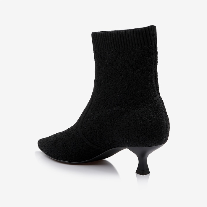 Pointed-toe ankle boot featuring flyknit upper construction with embroidered detailing and feminine kitten heel silhouette designed for contemporary women’s footwear collections.