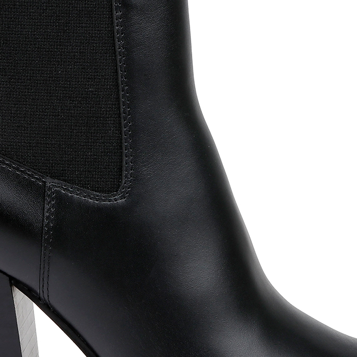 Crafted from high-shine cow leather upper with integrated elastic gore panels for secure fit. Features 3.27″ (83mm) stacked heel construction for elevated profile and enhanced presence.