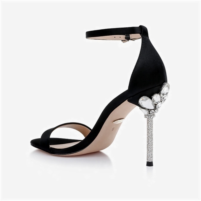 Stiletto heel measures 3.94″ (100mm) ultra-high height. Real silk satin upper material with flower-shaped stone heel detailing. Buckle fastening system ensures adjustable ankle support.