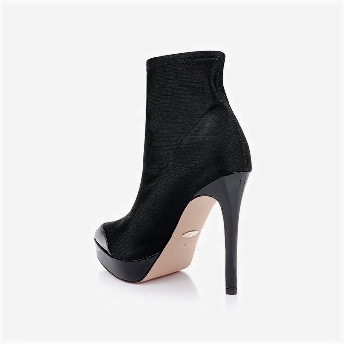 Construction combines easy-wear lycra upper with patent leather-wrapped heel and wedge components. 4.72″ (120mm) stiletto heel with 1″ (25mm) integrated wedge platform provides dramatic height with improved stability. Pointed toe design maintains streamlined profile.