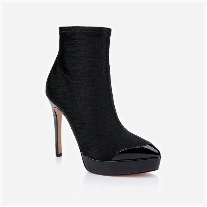 Sky-high stiletto pointed toe boot featuring dual-material construction with stretch lycra upper and patent leather heel coverage. Sleek pointed toe silhouette delivers contemporary edge with enhanced comfort through flexible textile integration.