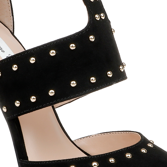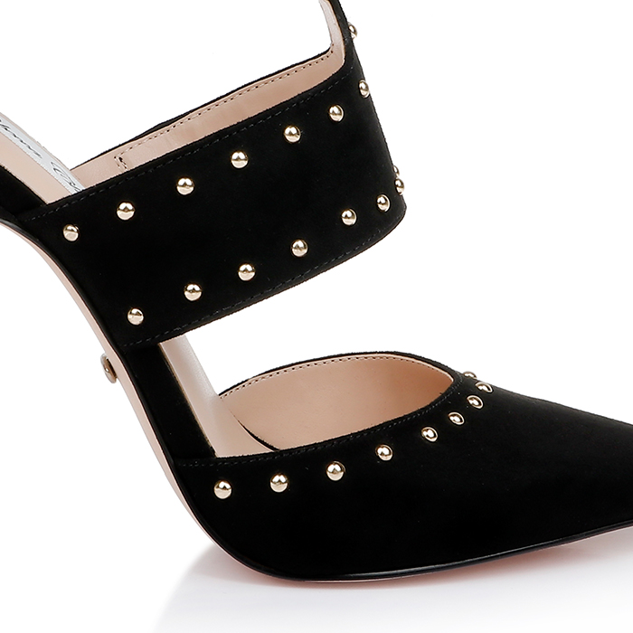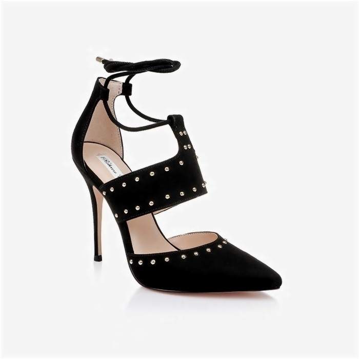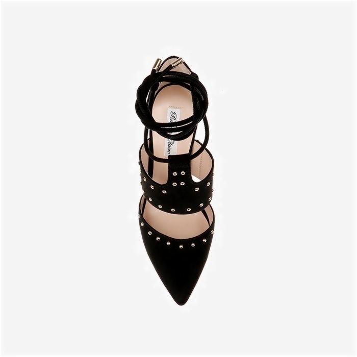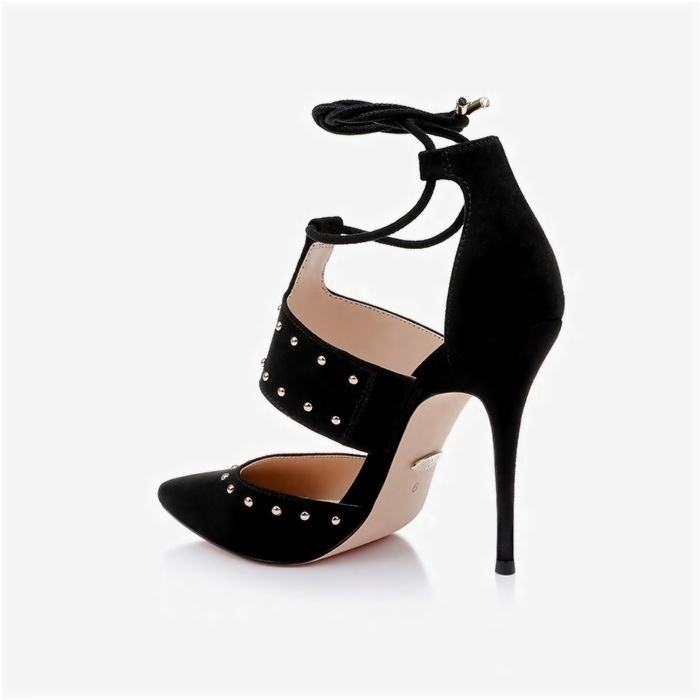 Pointed-toe stiletto sandal featuring microsuede upper construction with decorative studding and lace-up closure system. Self-covered heel design delivers seamless aesthetic integration with upper materials.