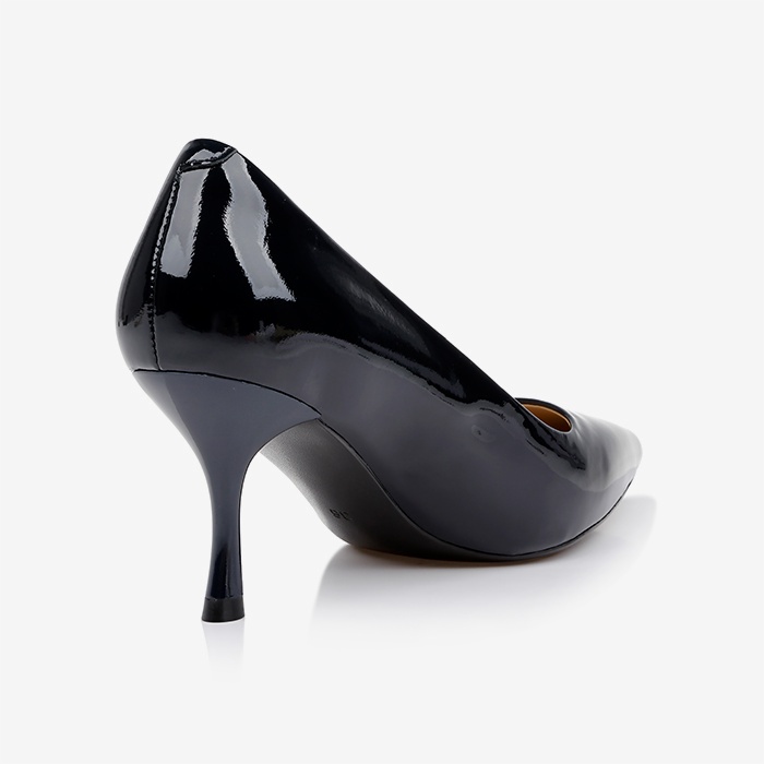 Mid-height patent leather pump featuring a pointed toe silhouette and stiletto heel construction. Clean, streamlined design with high-gloss patent finish for contemporary professional and evening wear applications.