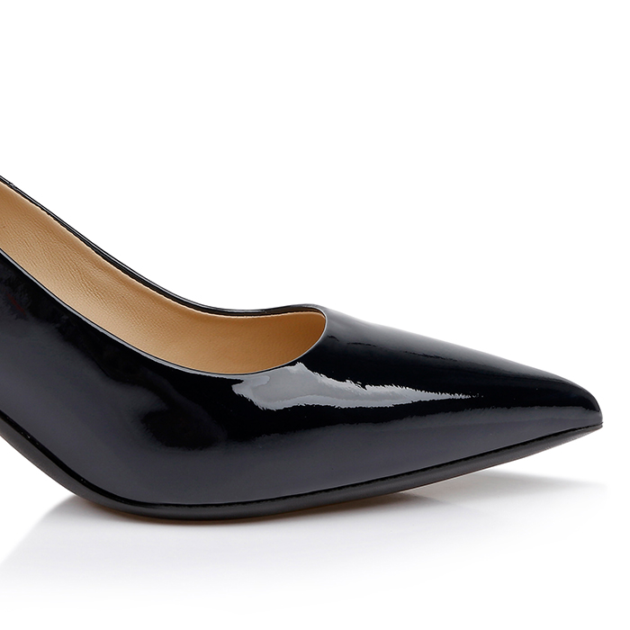 Upper constructed from genuine patent leather with Strobel insole system for enhanced flexibility and comfort. Stiletto heel measures 2.56″ (65mm) height. Pointed toe last provides sophisticated elongated profile suitable for narrow to medium foot widths.