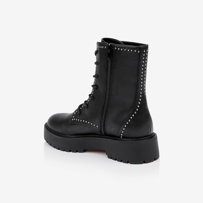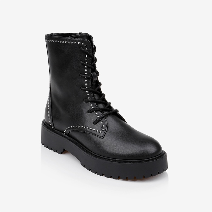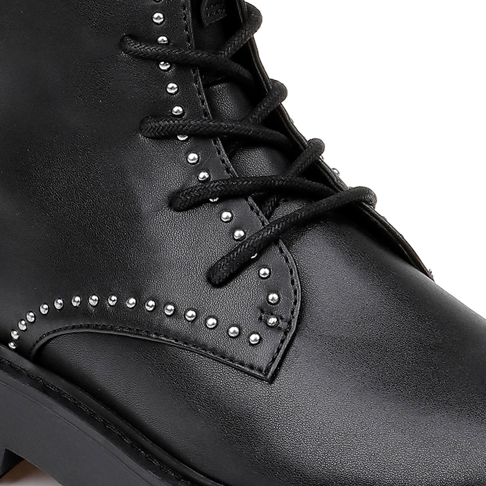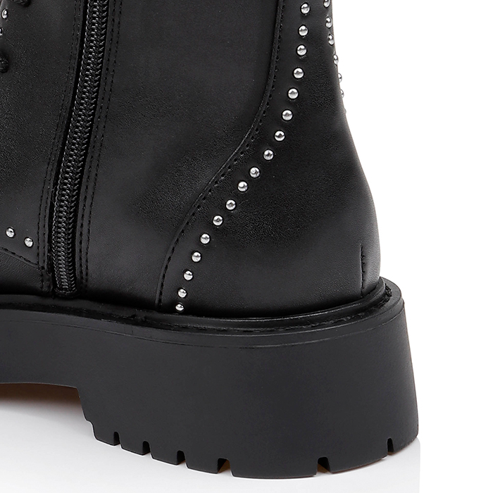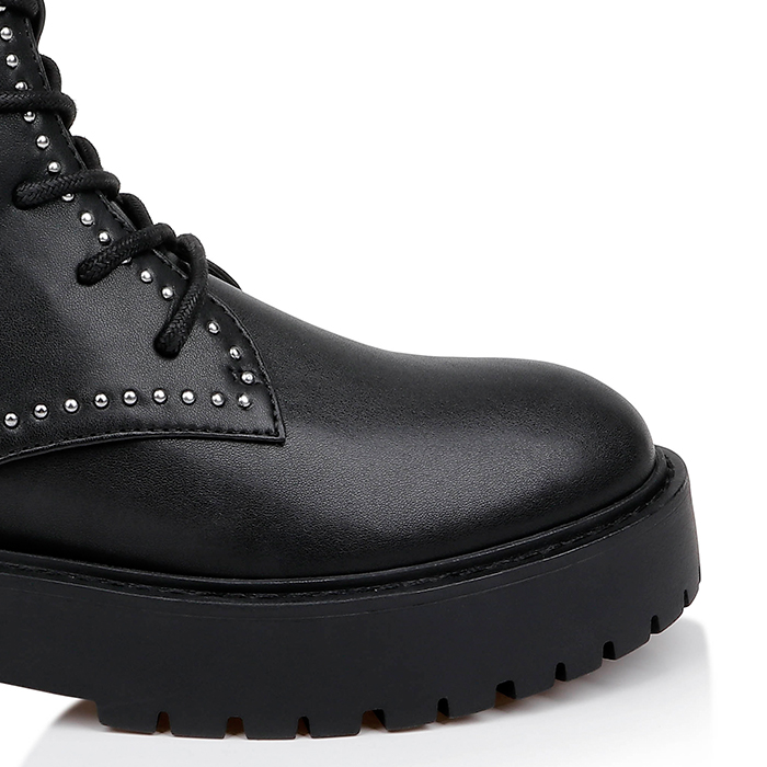 Edgy synthetic leather boots featuring distinctive metal stud detailing across the upper for contemporary punk-inspired aesthetics. The streamlined silhouette combines urban attitude with versatile wearability.