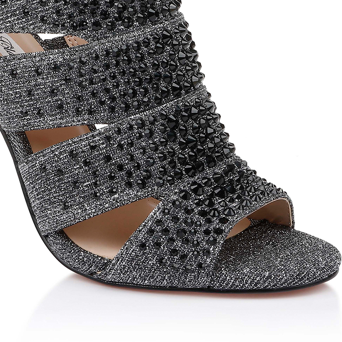 Ultra-high 3.94″ (100mm) stiletto heel construction with shiny textile upper material. Full stone decoration treatment across upper provides enhanced visual impact and texture variation.