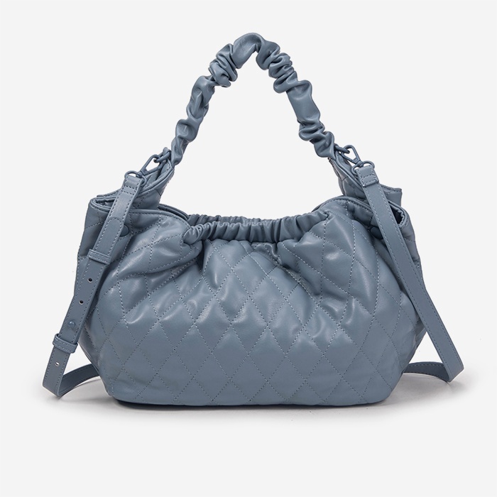 Premium lamb leather tote bag featuring distinctive diamond-quilted body construction with elegantly wrinkled handles and ruched opening detail. Design combines sophisticated texture work with practical daily-use functionality.