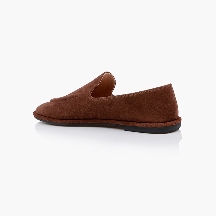 Brown cow suede leather pump featuring Strobel construction for enhanced flexibility and comfort. Clean loafer silhouette with premium suede upper delivers versatile styling for contemporary collections.