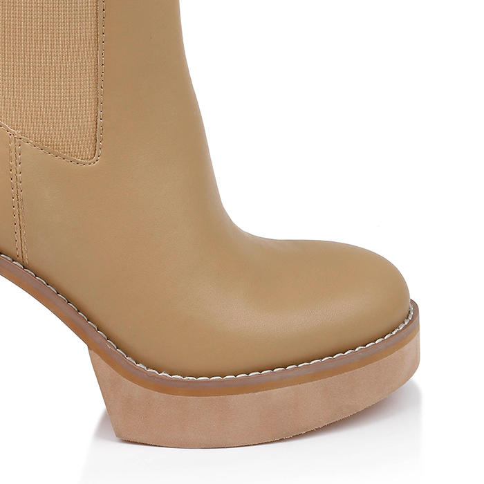 High ankle boot featuring synthetic leather upper construction with elastic shaft design for effortless slip-on wear. Platform sole configuration balances the elevated heel height while providing enhanced comfort and stability for extended wear.