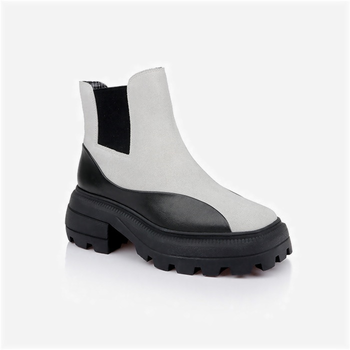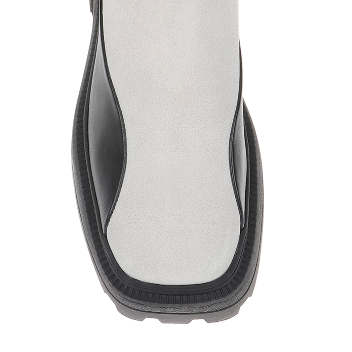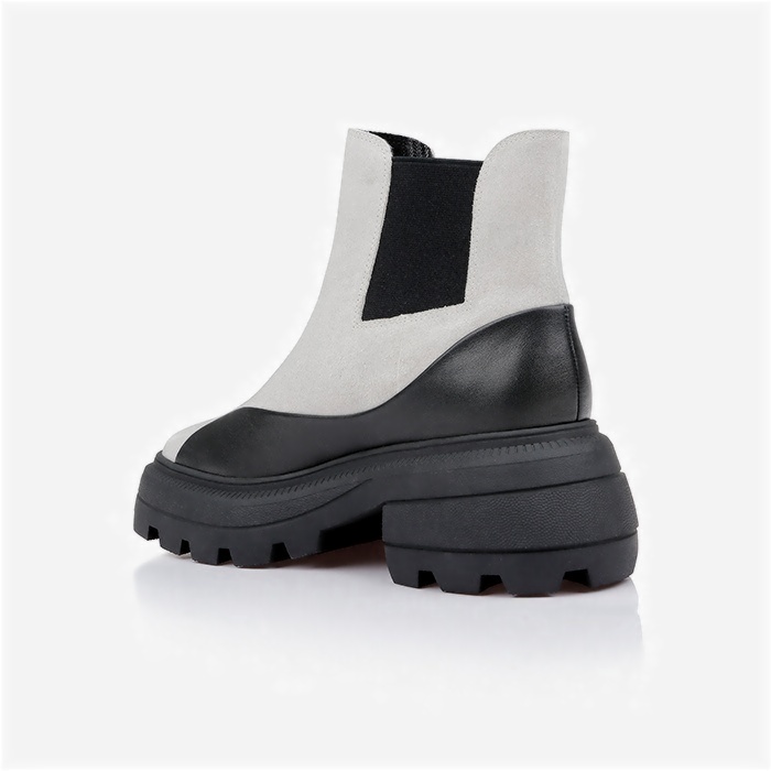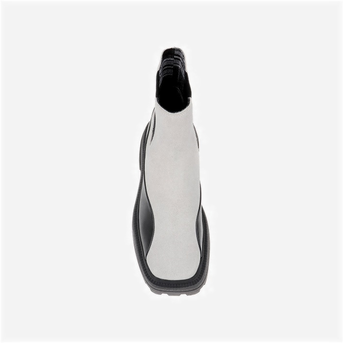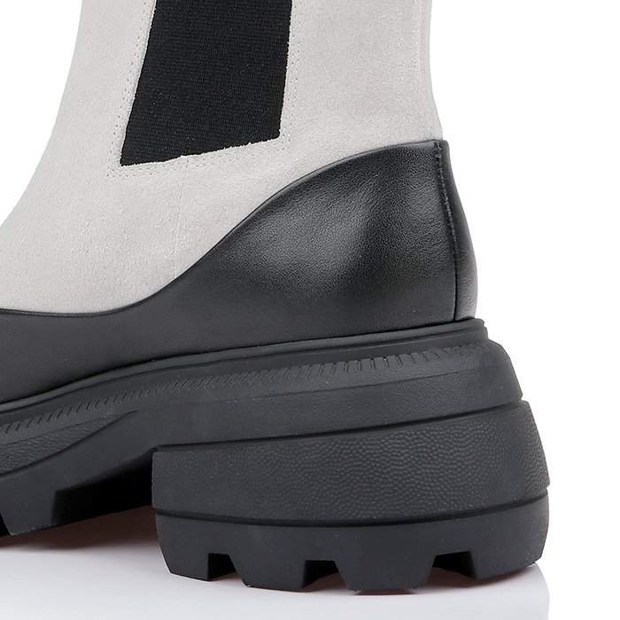 Mixed-material ankle boot featuring cream cow suede upper with contrasting black cow leather accents and squared toe silhouette. Wide elastic band construction provides secure fit while TPU leather-look detailing adds modern contrast elements.