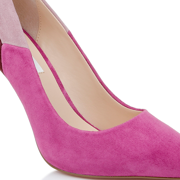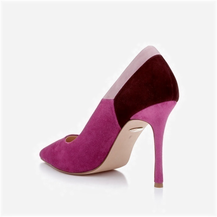Professional stiletto pump featuring mixed kid suede construction with eye-catching cross-color upper design. Pointed toe silhouette delivers contemporary elegance for high-end retail positioning.