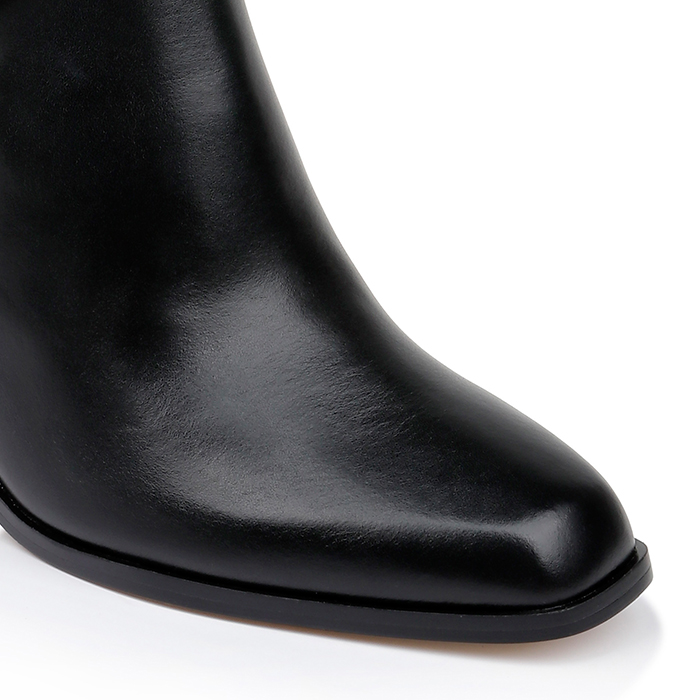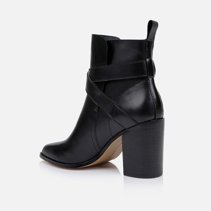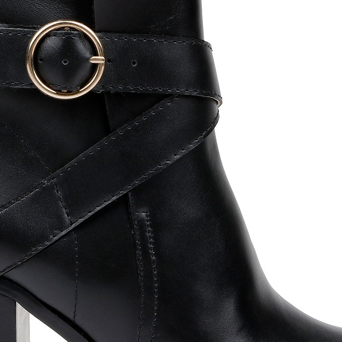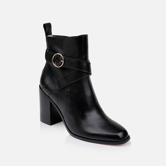 Classic ankle boot featuring premium black cow leather construction with distinctive oversized metal buckle straps for contemporary edge. Clean silhouette balances timeless appeal with modern hardware detailing.
