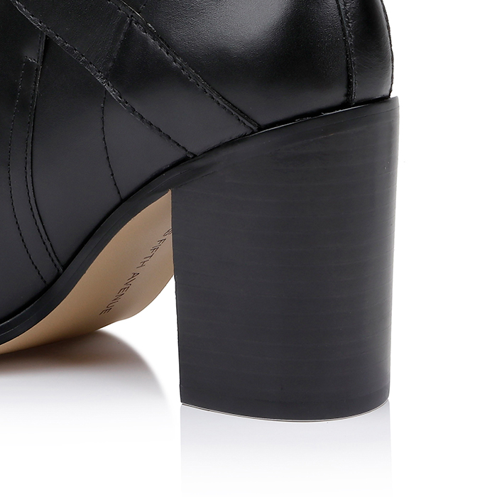 Full grain cow leather upper with leather lining throughout. 3.15″ (80mm) stacked heel provides elevated profile while maintaining walkability. Robust metal buckle hardware offers adjustable fit and visual contrast against high-shine leather finish.