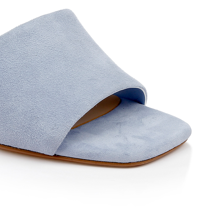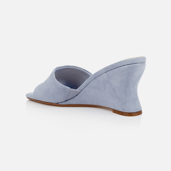 Square-toe wedge sandals crafted from premium kid suede featuring a minimalist one-piece upper construction for contemporary appeal and streamlined production.