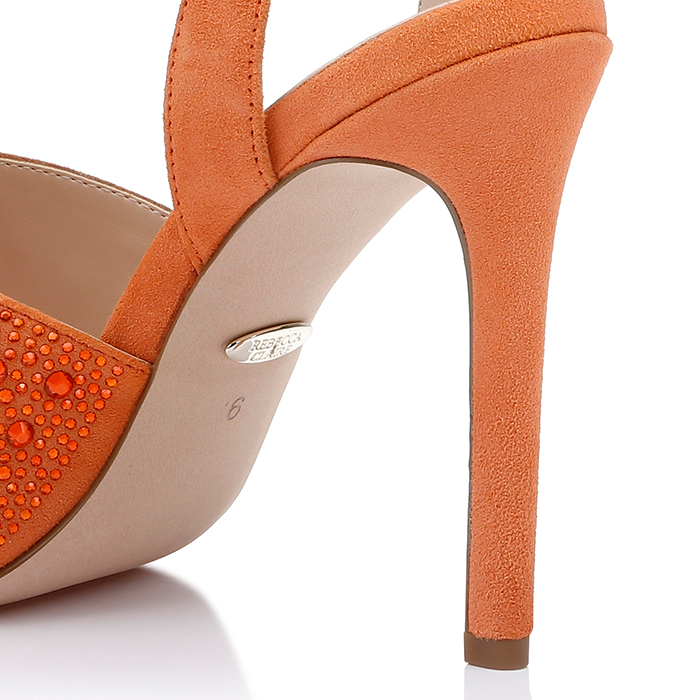 Ultra-high stiletto sandal featuring suede strap construction with glamorous hotfix stone detailing. Round-toe silhouette with ankle strap and buckle closure delivers secure fit and contemporary appeal for evening and special occasion wear.