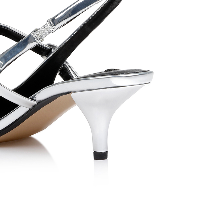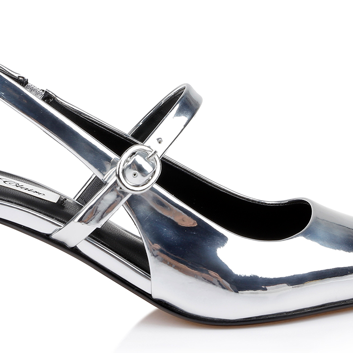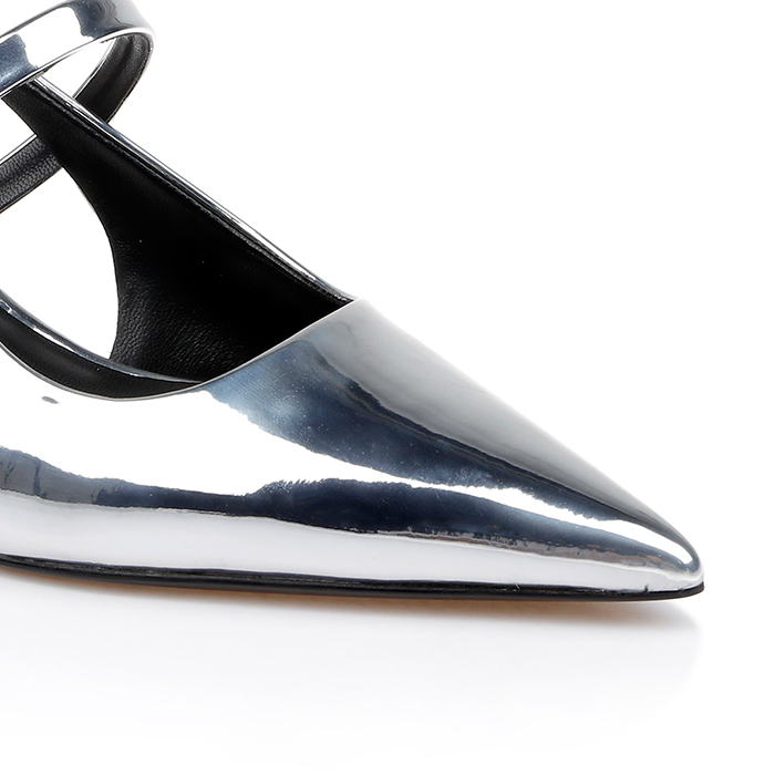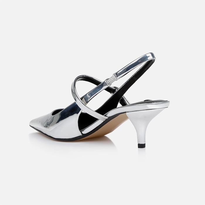 Silver Specchio synthetic sandal features a pointed toe silhouette with slingback design and adjustable buckle closure. The sleek profile combines a foot strap with elastic band integration for secure fit and easy on/off functionality.