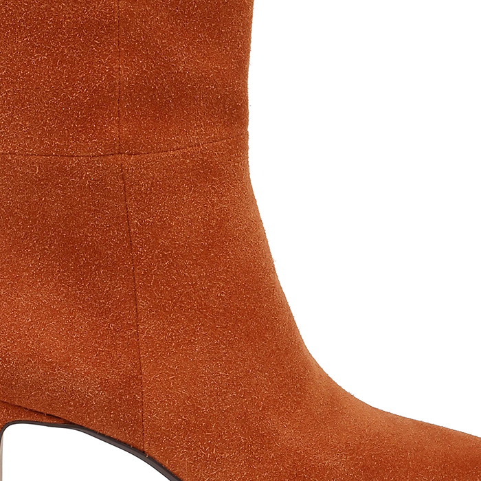 Mid-height long boot featuring premium cow suede construction in a rich umber colorway. Clean silhouette with self-color fabric-covered heel creates a sophisticated monochromatic aesthetic ideal for contemporary footwear collections.