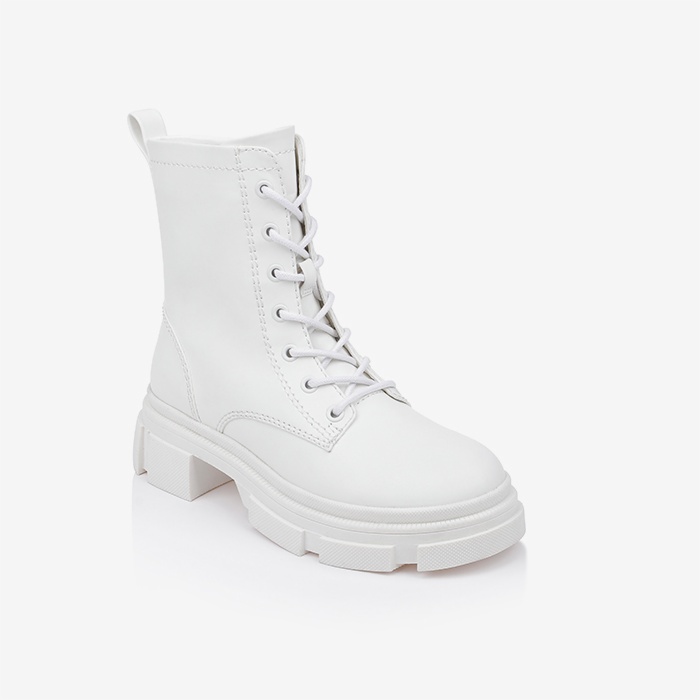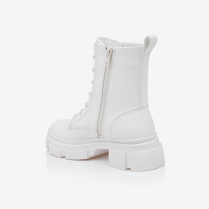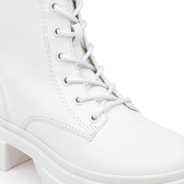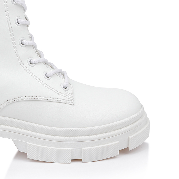 White synthetic leather ankle boot featuring a contemporary lace-up design with rugged, oversized outsole construction for extended wear comfort. Clean silhouette combines urban styling with functional support elements.